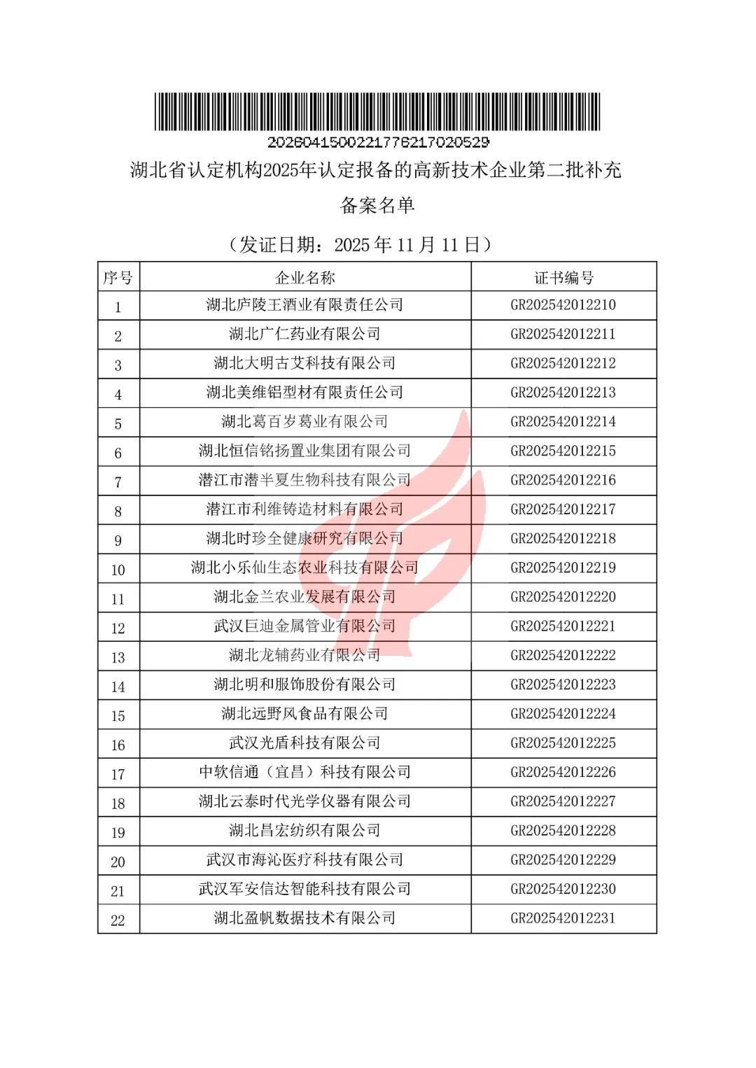 对湖北省认定机构2025年认定报备的高新技术企业进行第二批补充备案的公告