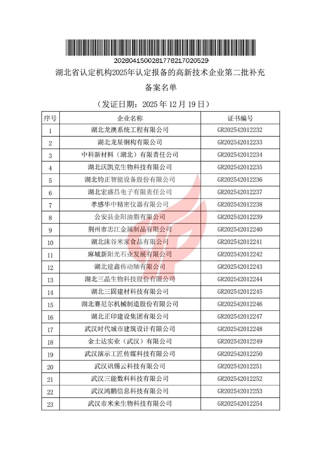 附件:湖北省认定机构2025年认定报备的高新技术企业第二批补充备案名单