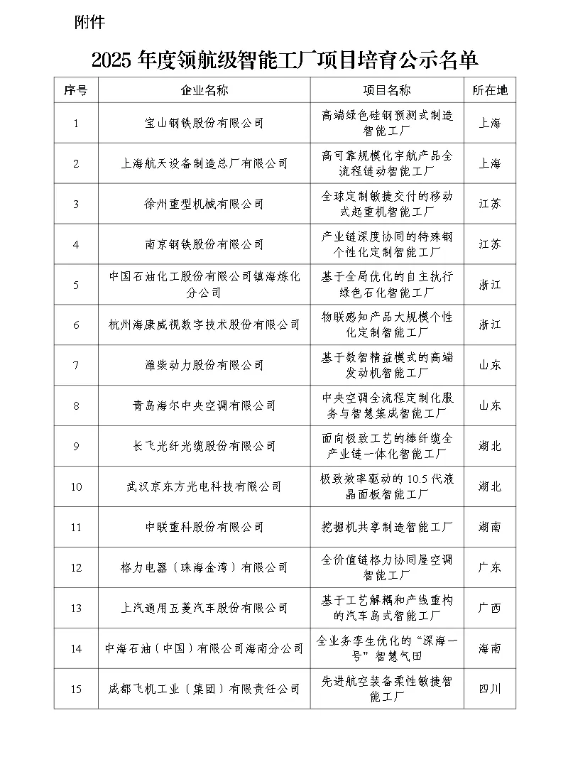 根据《关于开展2025年度智能工厂梯度培育行动的通知》(工信厅联通装函〔2025〕251号),现将拟入选的2025年度领航级智能工厂项目培育名单进行公示,请社会各界监督。如有异议,请在公示期内将书面意见反馈至工业和信息化部装备工业一司(智能制造处)。