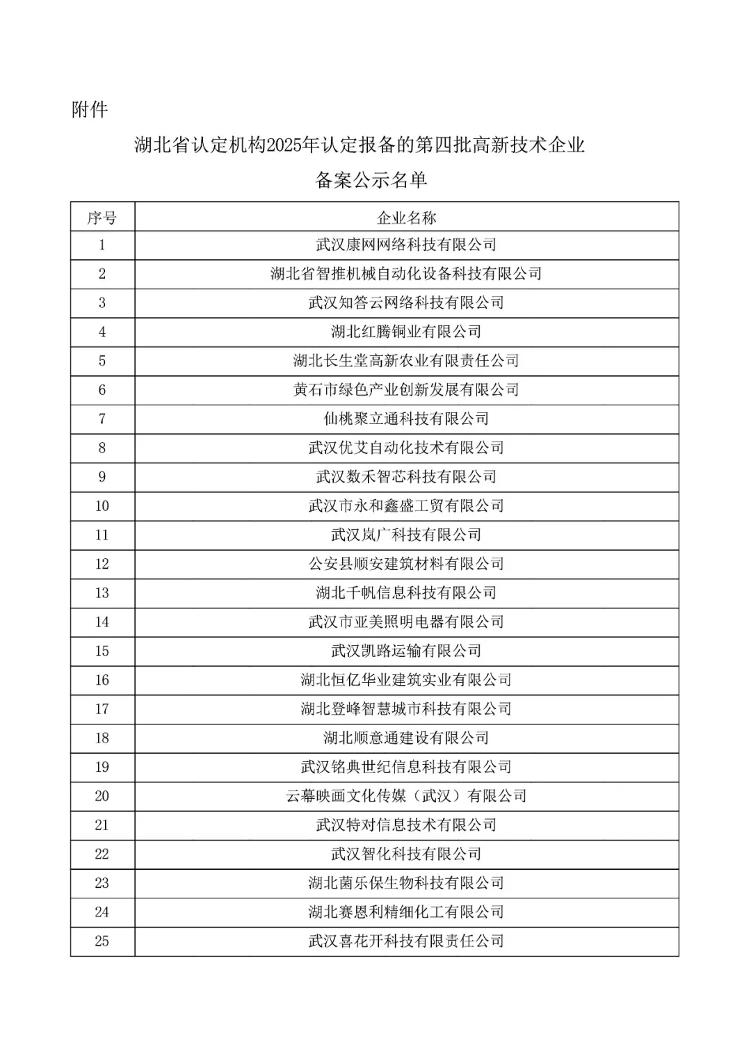 附件:湖北省认定机构2025年认定报备的第四批高新技术企业备案公示名单